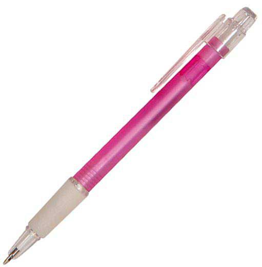 Długopis wykonany z transparentnego, matowego plastiku. Posiada duży, niebieski wkład oraz gumkę antypoślizgową. Proponujemy umieszczenie nadruku reklamowego na korpusie.