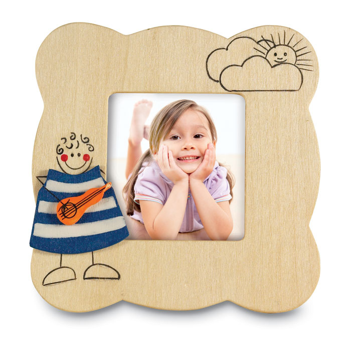 Drewniana ramka do fotografii z figurkami dzieci. Rozmiar zdjęcia 4,5cm x 4,5cm.