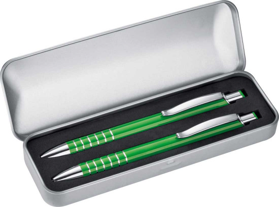 Wysokiej jakości zestaw piśmienny składający się z długopisu piszącego na niebiesko oraz ołówka automatycznego. Całośćzostała umieszczona w estetycznym, metalowym etui.