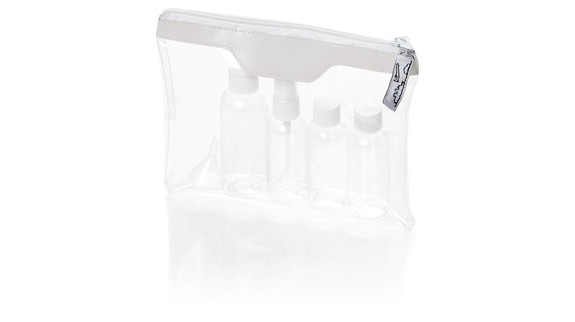Zatwierdzona przez linie lotnicze transparentna kosmetyczka, której zawartość można wnie?ć na pokład, zawiera: 2x50ml puste buteleczki, 1x90ml pusta buteleczkę, lejek. Nadruk niemożliwy na poszczególnych elementach.