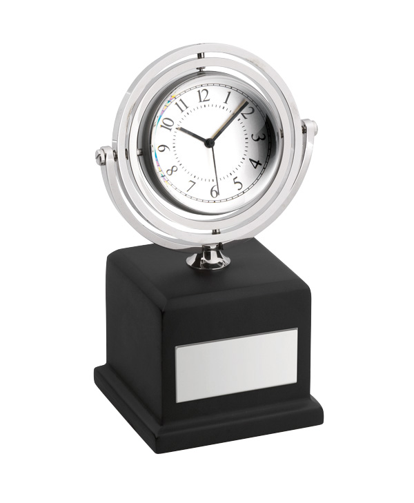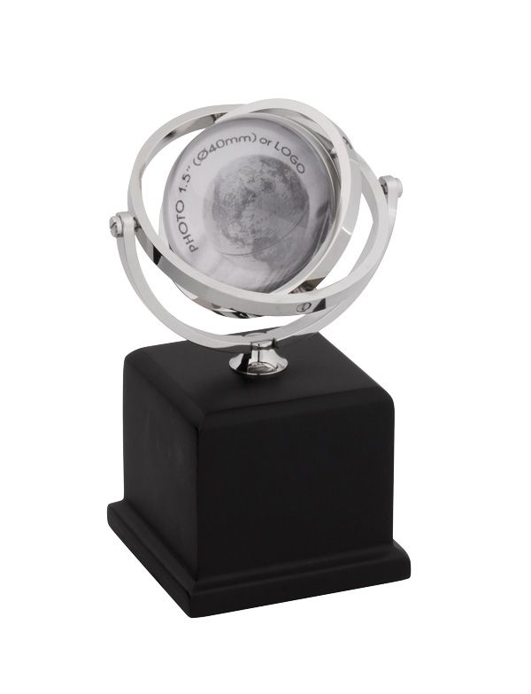 Metalowy zegar na biurko MALMÖ w kształcie kuli ziemskiej, zegar z przodu, ramka na zdjęcia z tyłu, drewniana podstawa z płytką na reklamę, bateria: 1 x SR 626 SW.
