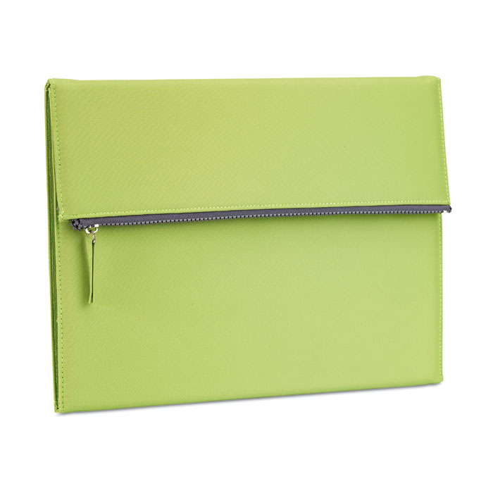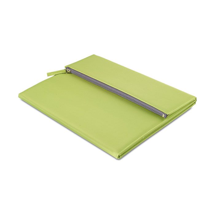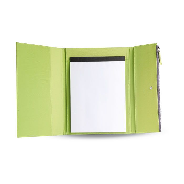 Portfolio A4 z mikrofibry i blok 50 białych kartek. Boczna klapa zamykana na suwak, w której możesz przechować długopis lub ołówek.