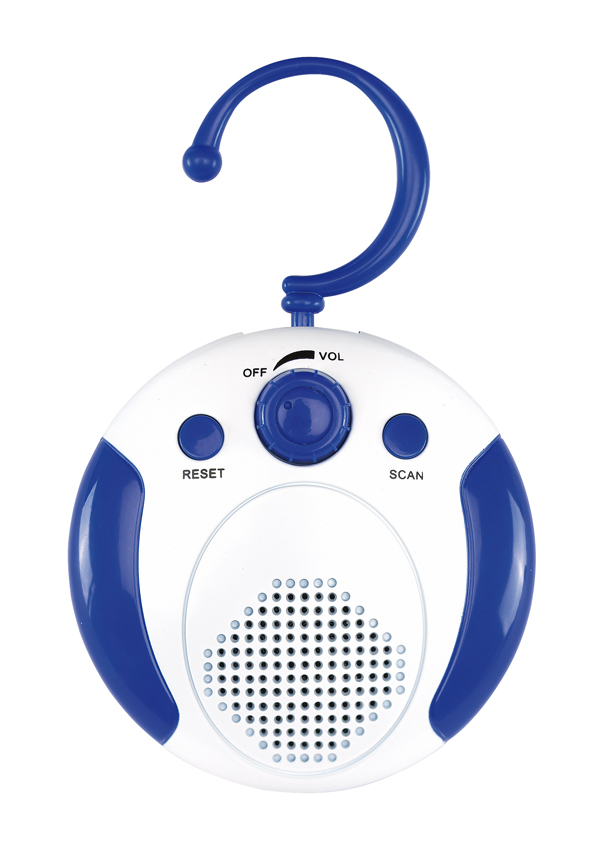 Radio kąpielowe "Fresh" z automatycznym wyszukiwaniem stacji i hakiem do zawieszenia.