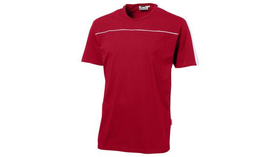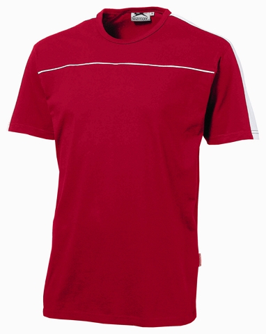 T-shirt ze szwami bocznymi. Kołnierzyk wykonany splotem rib knit. Kontrastowe przeszycie na wysokości piersi i wstawki wzdłuż ramion. Metka przy bocznym szwie.