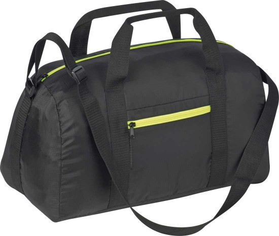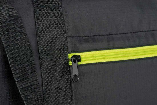 Czarna torba sportowa, wykonana z poliestru z zamkiem w żółtym, neonowym kolorze. Posiada dużą komorę wewnętrzną i kieszeń zapinane na zamek błyskawiczny oraz rączki do trzymania i regulowany pasek na ramię.
