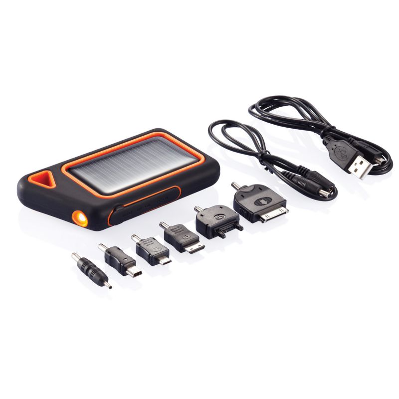 Zestaw z panelem słonecznym w gumowej obudowie i akumulatorem litowym o pojemności 750mAh z wyjściem 5V/max. 500mA do ładowania telefonu komórkowego lub odtwarzacza MP3. 6 wtyczek dla różnych modeli telefonów, kabel wejściowy USB, kabel wyjściowy, dioda LED. Pokrowiec z karabińczykiem.