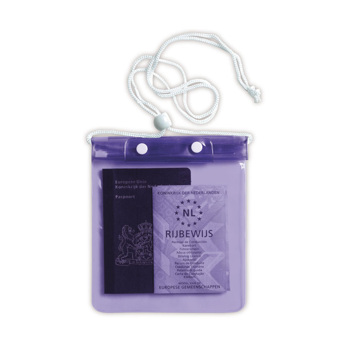 Wodoodporny przezroczysty portfel z zawieszką na szyję. Wykonany z PVC.