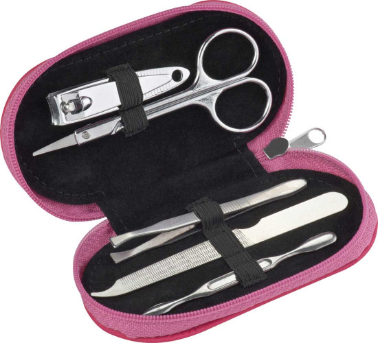 Podręczny zestaw do manicure zawierający nożyczki, cążki, pęsetę oraz pilniczek do paznokci. Całośćumieszczona w estetycznym etui w modnych, soczystych kolorach.
