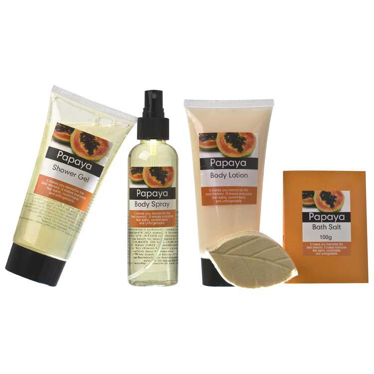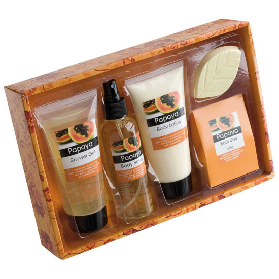 4-częściowy zestaw kąpielowy w czterech zapachach: papai, oliwkowym, różanym i waniliowym. Zestaw składa się z żelu pod prysznic, sprayu do ciała, balsamu do ciała i soli do kąpieli.